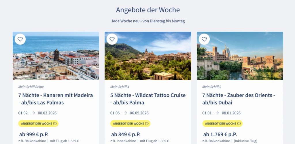 Die Angebote der Woche gelten von Dienstag bis Montag und sind limitiert – sowohl zeitlich als auch in der Verfügbarkeit der Kabinen. Wer zuerst kommt, reist günstiger!